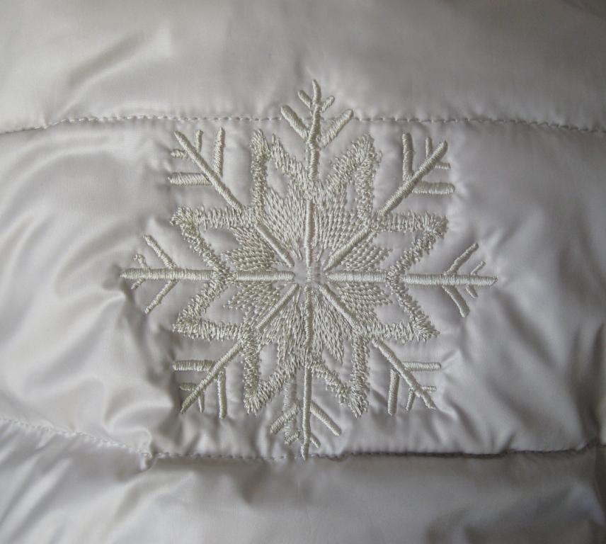 Одна деточка катала на санках другую деточку,а потом завалилась на эти санки спиной (так мне и не удалось понять,как так можно),но пуховик разодрала на спине.Пришлось подлатать,машинка еле прожевала эту толщину ,получилось вот так