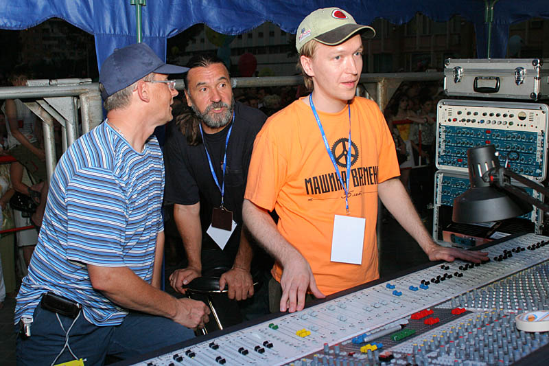 Тот самый Soundcraft и "рулевые". Ф.М.: "Не, Макаревич круче!" Н.П.: "Много ты понимаешь! Лучше Маргулиса нет!" Звукорежиссер МВ: "Эх, если бы меня на сцену выпустили - я бы показал! А приходится за пультом торчать..."