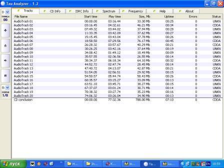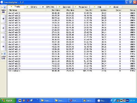 Вернер Спасибо! Отличная программа! Весит 300 Кб и быстро работает. Правда, иногда выдает unknown, что, как я понял, равнозначно мпег - анализируется диск, сделанный из мп3, по трекам выдается вперемежку статус - mpeg или unkn и общий итог анализа такого диска (CD conclusion) - mpeg. Вложения с картинками по 33 Кб. Так выглядит основная страница анализа. Диск сделан из МП3