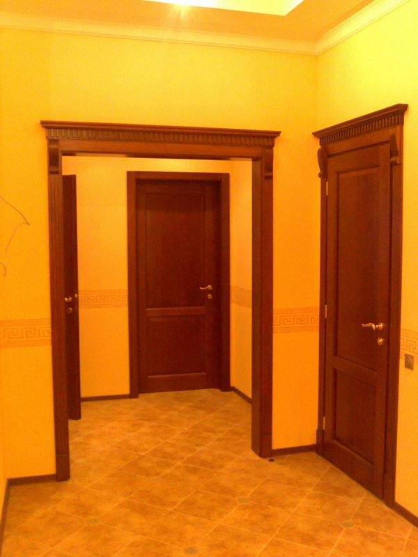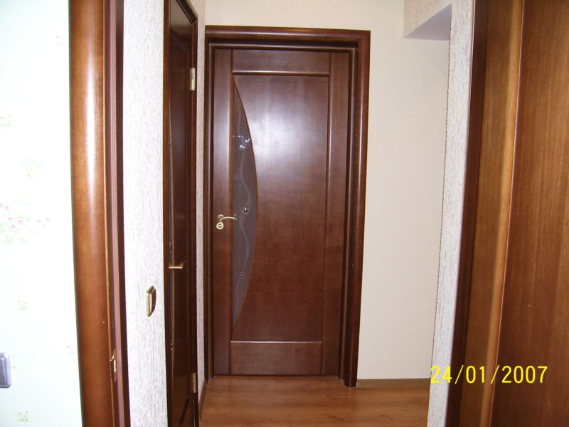 А Вы определитесь, какие двери нужны Дешёвые - пОлые с какой-нить облицовкой из ПВХ\пластика (наподобие тех, что в ванную\санузел) Подешевле - из туфты, облицованные шпоном, имитирующим ценную породу дерева (правда, шпон бывает и действительно настоящим) Средней цены - из цельного массива сосны, предварительно обработанные морилкой для придания нужного цвета и покрытые сверху лаком. Подороже - из цельного массива ценных пород . . . Дорогущие - см.фотку FIRSa Кстати, совет, дверь-стекло-фурнитуру-установку двери лучше делать у одного продавца, ибо "у семи нянек..."