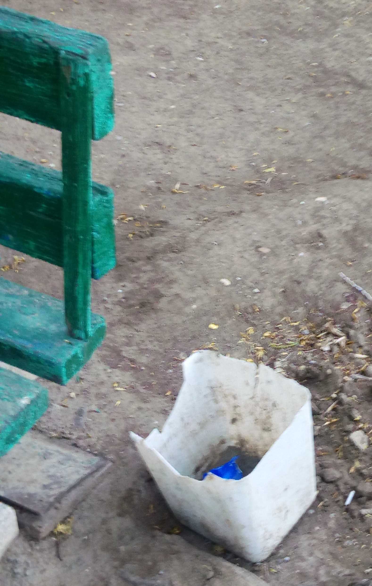 Сцуко, днище. На данный момент установлено 2 урны. Фото безобразия: Зеленая вся уже ржавая внутри. Сгниет за 1 сезон - 100%. Честно говоря тне понятно это б/у урны или самоделка из стоек и б/у ведра из-под краски.