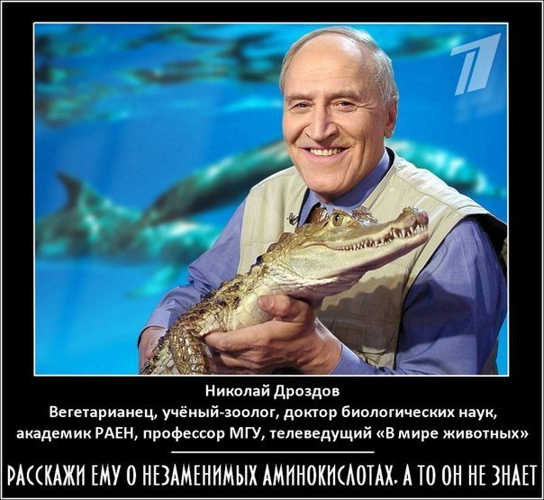 тут уже обсуждались эти картинки. Вторая недоказуема. По первой - ну 78 лет ему, ну Дроздов, и что. Сколько на одного вегетарианца-академика не вегетарианцев. Дроздову положено, он животных любит, это его профессия. Мой дед прожил больше 90 и ел все подряд. Первый дед прожил более 80 и тоже не помню, чтобы был вегетарианцем. Оба были активны и ясны умом. То же самое могу сказать про бабушек. Я говорю это не потому, что против вегетарианцев (мне все равно, кто чем питается), а потому, что вы публикуете нелогичные вещи.