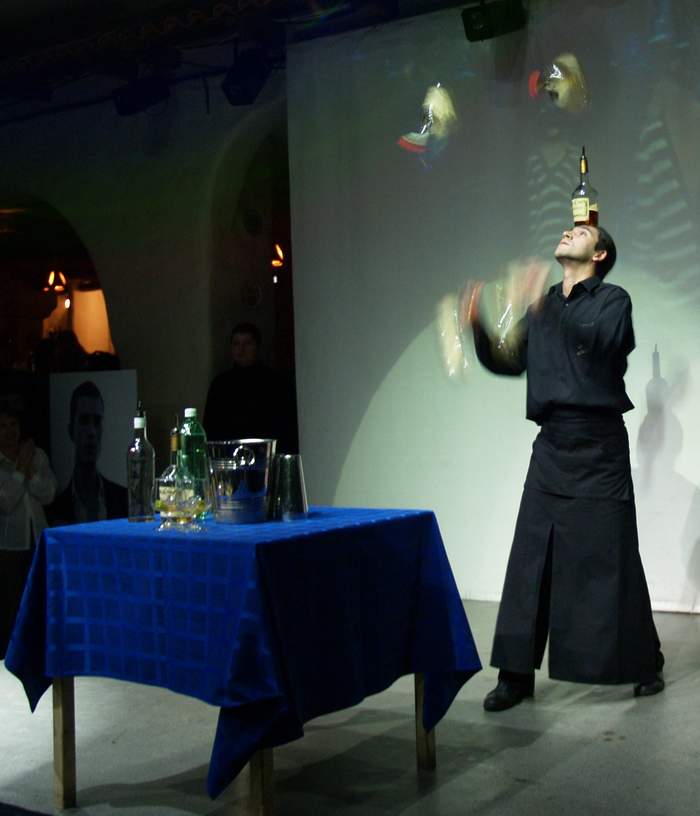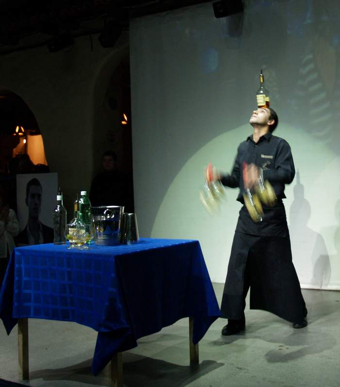 Вот моих немного кадров. С презентации Л'этуаль в "Ибисе". Бамен-шоу. Последние 3 кадра - серия снимков за 1 секунду. У бармена 1 бутылка на голове и по 2 в каждой руке. И он начинает жонглировать...