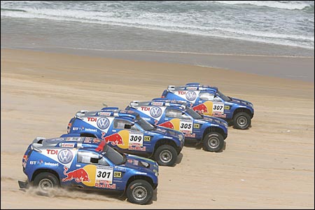 Владимир ЧАГИН: "МЫ НЕ ИМЕЛИ ПРАВА ОШИБАТЬСЯ!" Как уже сообщал "СЭ", "Дакар"-2006 завершился очередной, уже пятой по счету победой российского экипажа "КамАЗа" в составе Владимира Чагина, Семена Якубова и Сергея Савостина. Кстати, в этом году они отметили 10-летний юбилей своего спортивного содружества. НОВЫЙ РЕКОРД Сколько раз читала о том, что Розовое озеро в столице Сенегала Дакаре действительно розовое. По поводу причины столь необычного для воды цвета источники расходятся. По одной версии, такой оттенок ей придает глинозем. По другой - все дело в некой галофитной бактерии, вырабатывающей розовый пигмент. Причем вода в озере настолько соленая, что никакое живое существо, кроме этой самой бактерии, там не выживет. На протяжении всего года, за исключением дня "дакаровского" финиша, на озере ведут добычу соли самым простым из известных способов: стоя по горло в воде, черпают ее кристаллы со дна и перегружают в лодки. 15 января Розовое озеро не было розовым... То ли вместе с солью вычерпали весь глинозем, то ли соленая вода все-таки убила все живое, включая галофитную бактерию. Но недостаток розового цвета компенсировался обилием сине-голубого. Болельщики "КамАЗ-Мастер" раскрасили этими фирменными цветами команды весь финишный городок. А когда пришла очередь въехать на пьедестал "КамАЗа" Владимира Чагина, Семена Якубова и Сергея Савостина, синие майки окончательно затмили все и вся. Вечером "КамАЗ-Мастер" отмечала в ресторане "Терру Би" свою в общей сложности седьмую победу на "Дакаре". В этом году наша команда стала не просто в очередной раз лауреатом легендарной гонки, но и одним из ее рекордсменов. До 2006-го по количеству побед лидировала "Татра", завоевавшая шесть главных призов, теперь впереди всех "КамАЗ". ПЕСОК КАК МУКА - Каждый "Дакар" чем-то отличается от предыдущих гонок. В этом году скажем, старт был дан не 1 января, как обычно, а 31 декабря. Получается, что Новый год мы встречали уже в роли участников марафона, были, так сказать, на работе, - начал разговор Чагин. - Очень понравились этапы по Португалии. Раньше "Дакар" начинался с маленьких спецучастков по 4 - 5 км, а теперь организаторы сделали два по 100 км. Это были настоящие, полновесные этапы, и европейцы смогли увидеть настоящий "Дакар". Публики, надо сказать, было очень много - мы ехали в сплошном людском коридоре. Представляете, рано утром 1 января люди пришли, чтобы постоять на обочине дороги и посмотреть на машины! Причем народ собрался смелый: никто ни на шаг не отступал, когда мимо проносился наш грузовик. Мне самому временами было страшновато, а им, похоже, нет. Вообще, считаю, организаторы в этом году хорошо продумали всю гонку. Пик сложности пришелся на день перед и день после выходного. Такой трудный момент фактически был всего один за весь марафон. Весь ралли-рейд можно разделить на три части: скоростное начало по Африке, труднейшие этапы в районе дня отдыха и финальный "зеленый ад" по Гвинее. Жесткая середина гонки оказалась непростой и для нашего, казалось бы, уже ко всему привычному экипажа. Так как мы ехали в лидирующей группе, перед нами не было накатанной трассы, нужно было самим прокладывать дорогу в дюнах. И на перегоне Зуэрат - Атар, и на пути из Атара в Нуакшот мы застревали. Причем застревали не на участках, указанных в "дорожной книге", а когда искали проход в дюнах. Мавританский пе