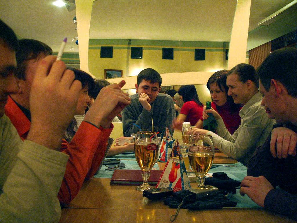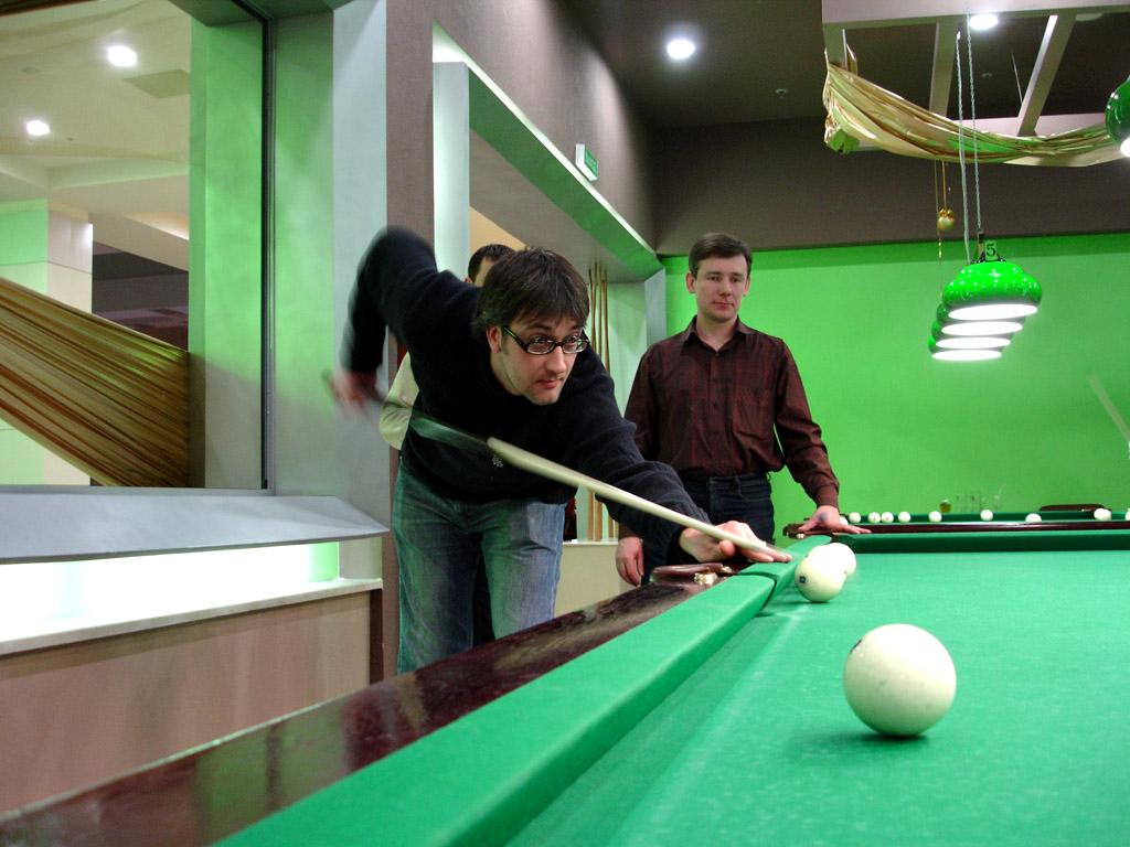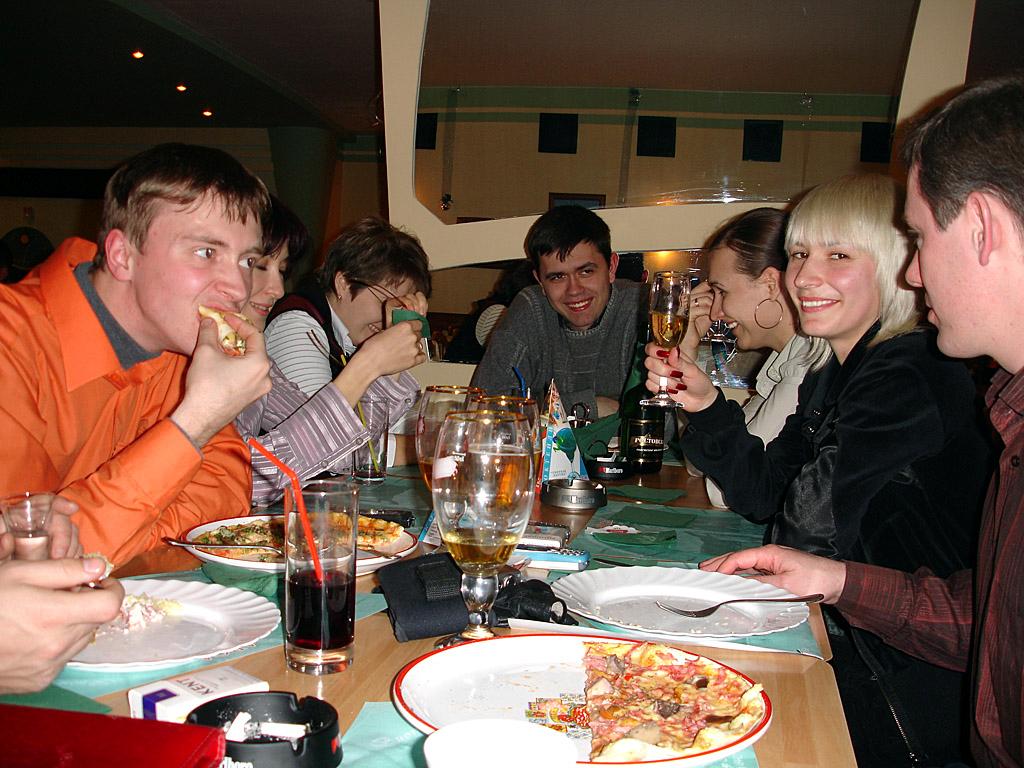 Было как всегда прикольно. Посидели там, сам и в Пиранью В Арке все голодные насытились свежеприготовленной пиццой (ох ну и долго же ее нынче производят!), наибольшее количество фотографирования пришлось именно на эту область времяпроведения, но не стоит так отчаиваться, ведь все еще впереди. Наевшись и наобщавщись народ стал медленно таять оставляя за собой пустые стулья и оплаченные счета... После некоторой зависшей паузы, остатки тусующихся переместили свои тела в ТРК Пирамида, который хоть расположен неподалеку. Там пройдя попутно все отделы поднялись на последний этаж и весело плюхнулись к столикам. Любители билльярда решили испытать свои силы, опять же попутно поглощая пиво и ведя светские беседы Ладно, придется порадовать вас и своей коллекцией различных фотографий... Сейчас продолжим описание действа.