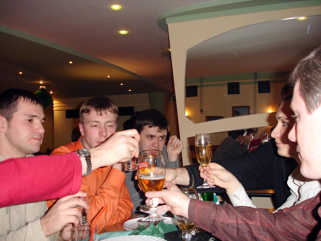 Весело добредя пешком по морозной улице до ночного клуба народ продолжил начатое гулянье. В Пиранье были забавные переписывания в жутко тормозящем чате этого ночного клуба. Тормозной аж жуть, зато вот Dj жжог и прилично. Разгоряченные безалкогольными коктейлями (мы же ведь знаем что алкоголь вреден в больших количествах народ тусовался не отходя от кассы, в нашем случае небольшой стойки. Каких особо голодных обитателей сцены высадили на этой самой сцене и они там ели, пили и заодно чего-то там живенько выступали на сцене. Я там в клубе какой-то милой девушке сломал ноготь, пришлось в знак осознавания своего безответственного поступка приобрести ей коктейль, попутно извиняясь, все таки ноготь - очень серьезная травма для каждой девушки. В общем часов до 3х (или позже?) продолжалась тусовка... В общем мероприятие прошло на твердую пятерку, спасибо всем приглашенным и пригласившим Надеюсь всех вас еще раз увидеть. С уважением, adaptor.
