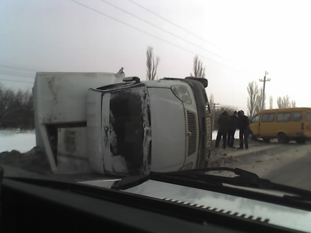 Ничего страшного там не было. Маршрутка столкнулась с газелью саратовской (которая на снимке). У маршрутки левое переднее крыло повреждено и капот. Газель грузовая перевернулась, но помята не сильно. Колбаски только из кузова высыпались Хотя увозили ее на эвакуаторе... По-моему, при таких повреждениях ничего серьезного быть не могло. Надеюсь, только ушибы и ссадины. В пробке минут 15 простояли.
