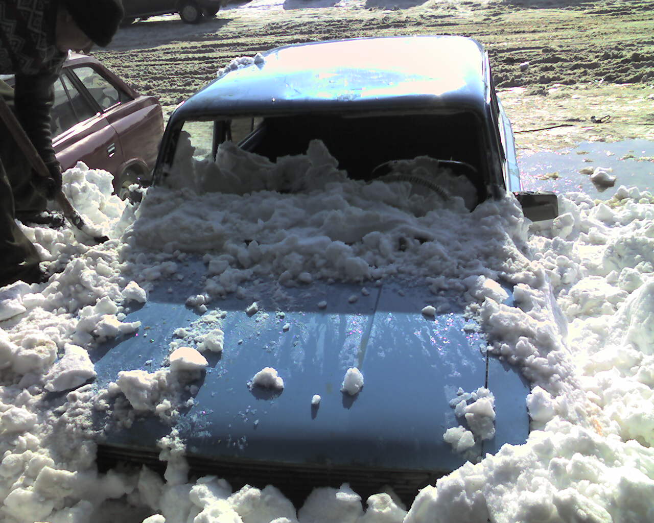 Мораль: надо думать, куда ставишь машину. Вполне нормально, что в весеннюю оттепель с крыш падает снег.