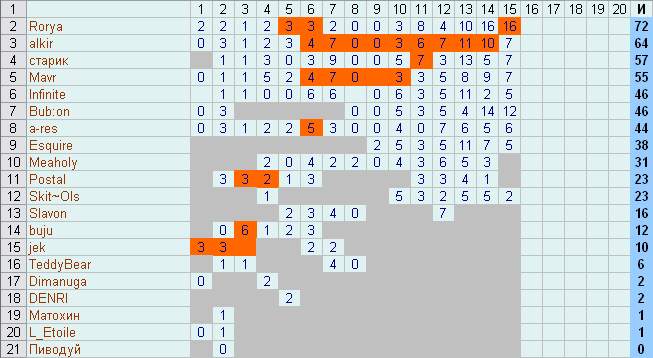 Результаты пятнадцатого тура: ч ФК Ростов - Торпедо М 1-1 ч Werden Bremen SV - Bayern Munich 3-0 ч Charlton Athletic - Everton FC 0-0 ч Сатурн - Шинник 3-0 ч AS Monaco - Olympique Marseille 1-0 ч Sporting Lisbon - FC Porto 0-1 ч Амкар - Динамо М 3-2 ч Спартак М - Локомотив М 2-1 ч Ajax Amsterdam - Alkmaar AZ 1-0 ч Athletic Bilbao - Mallorca RCD 1-1 ч Manchester United - Arsenal London FC 2-0 ч Juventus Turin - Fiorentina AC 1-1 Rorya повторяет свой же рекорд - 16 Bub:on - 12 alkir, старик, Mavr - 7 a-res - 6 Infinite, Esquire - 5 Skit~Ols - 2 Общий зачёт: Rorya обошёл лидировавшего долгое время alkir'а на повороте - 72 alkir - 64 старик - 57 Mavr - 55 Полная таблица во вложении