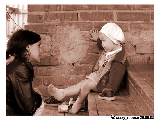 Cygnus, нет. На первой фотографии мама тонко намекает дочке, что обуваться ей при любом раскладе придётся самой, а если она, дочка, будет продолжать капризничать, то мама позовёт бабайку, то есть, пардон, папу. :smilewink Последнее заявление (больше похожее на угрозу) мамы для дочки оказалось более чем убедительным. Обуваться она решила самостоятельно, но вот с эмоциями справиться не удалось. О том и думает на фотографии №2.