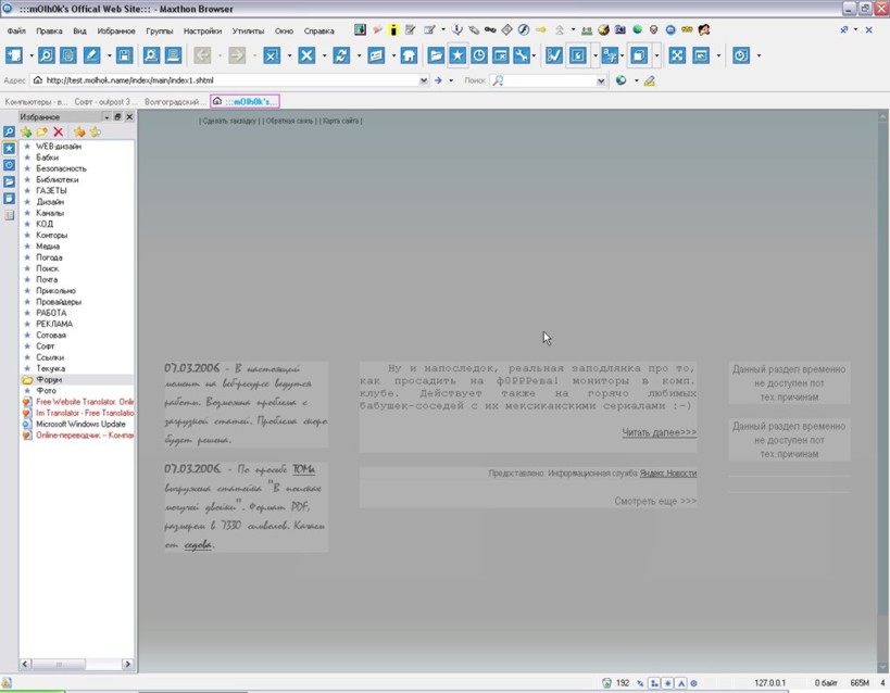 Ну вообщем-то все сказанное относилось к www.molhok.name. По поводу второго сайта сейчас. Дикие картинки при наведении на пункты меню - это излишне круто. Долго приходил в себя от удивления. По поводу мигания и шрифтов все то же самое, что уже сказано. Картинки в шапке немного грубоваты, чуть аккратнее их вырезать. И еще - сайт с трудом вмещается в 1024х768. А вообще первый сайт производит впечатление более выделанного, чувствуется более тщательный подход.