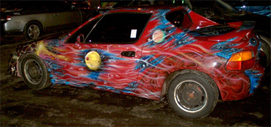рассказываю: 1) покрасить обычной краской, на неё аэрографию. Не в курсе, какие цены в Воло, сами только это направление у себя открываем, но в Мск - 250 бачей за деталь (дверь, багажник) при том капот и крыша - 2 детали. 2) хамелеон. если есть своя малярка (нашим ок. 30000р. выходит) а так от 50 до 70 тыс. руб. возьмут. 3) плёнка недорого, но 2 года макс, при среднем юзание авто.