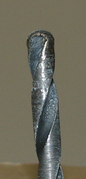 И последнее - сверло по металлу диаметром 10 мм. Про него я уже рассказывал - в теме "Не могу просверлить отверстие в металлической полосе..." На фото - снова (извините) конец сверла после того, как оно не осилило даже одного ответрстия. Отечественное сверло марки Р6М5 (кажется) пережило более 20 отверстий и издалека сразу и не определишь - какое из двух одновременно купленных свёрел новое, а какое - то самое...