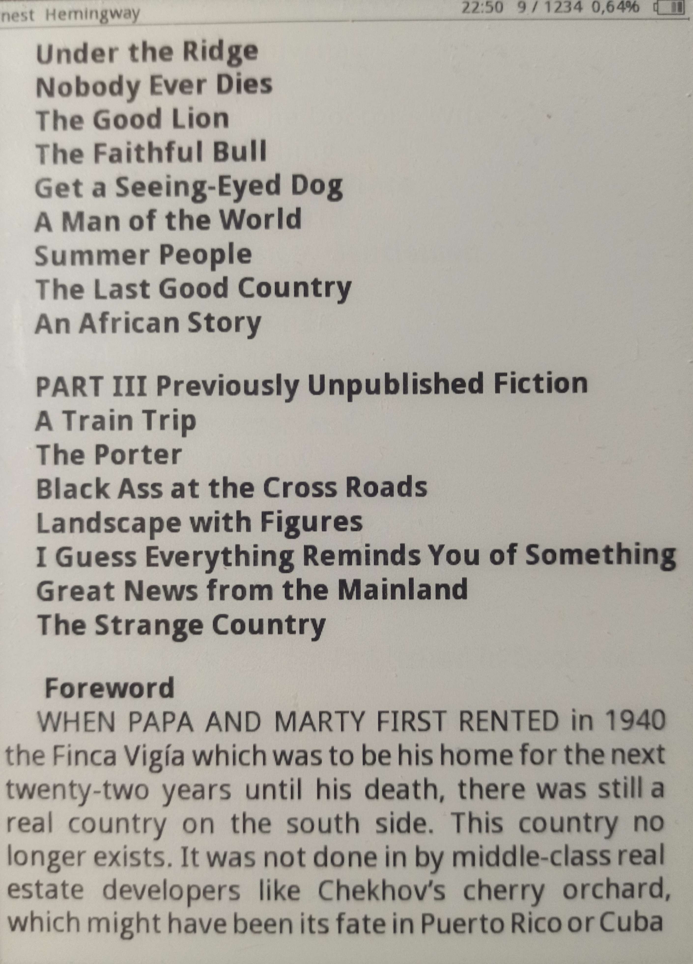 Я ж вижу, что я читаю, ну! Сборник рассказов. Коротких. Некоторые выглядят, как наброски. И я знаю, как называются ключевые произведения Хэма, просто люблю начинать щупать писателей с рассказов. Вот даже не поленюсь: