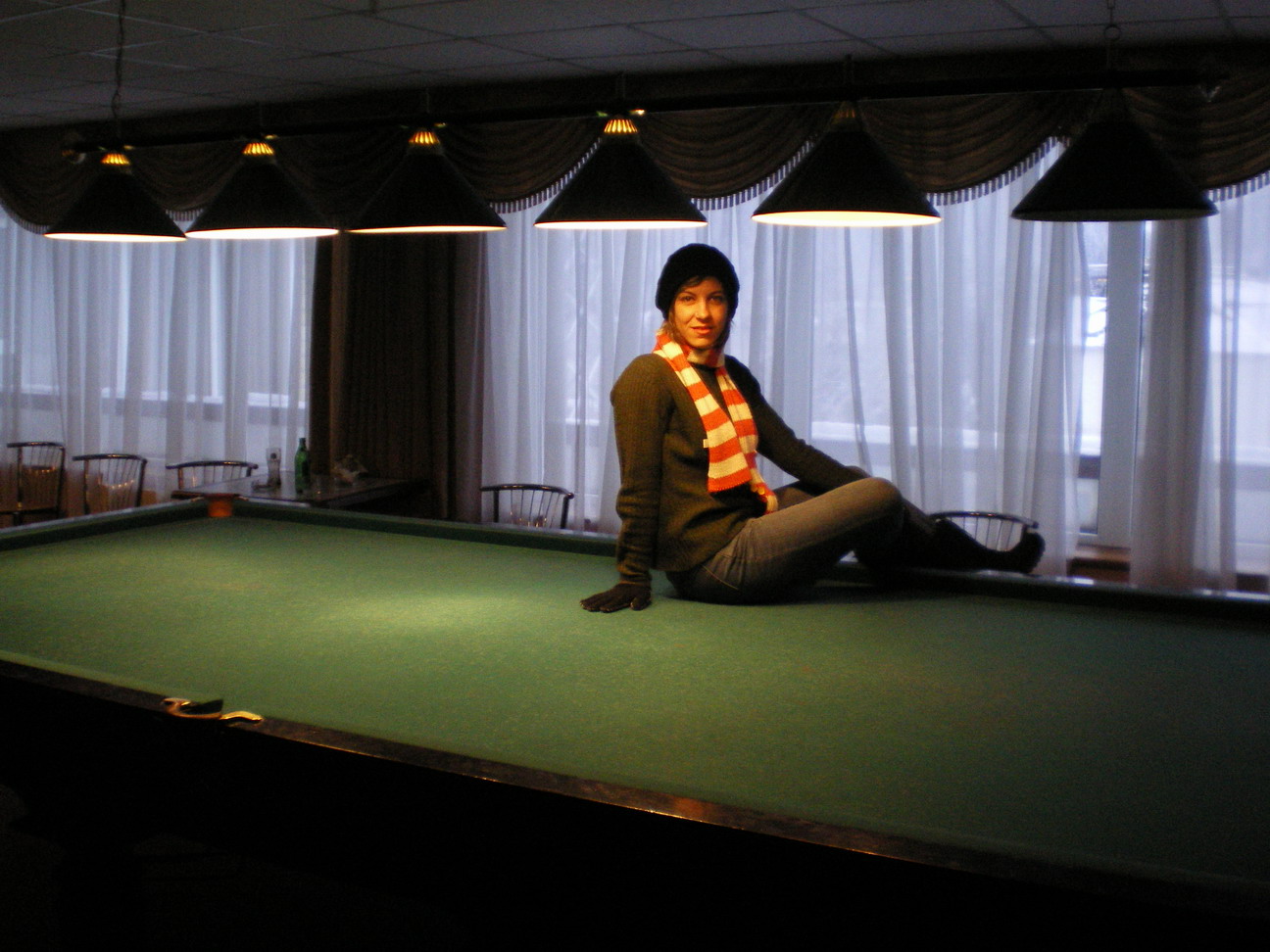 вчера играли вторую встречу с MAY в бильярдной рядом с Победой. столы там строгие, но состояние отвратительное: сукно потрепанное очень, но самое ужасное это лузы - очень много раз 100% шары именно выбрасывало из лузы, мастеру кто там проклеивал борта и лузы надо руки оторвать. +очень строгие угловые лузы -качество оборудования не позволяет выполнять и половину ударов, точнее выполнить то можно но исполнить результативно очень маловероятно. в общем это не бильярд там, а толкание шаров в лузы. именно по этому виду спорта вчера, не без везения, все-таки одержал победу 5-0))) в след раз предлагаю в Доме Офицеров играть.