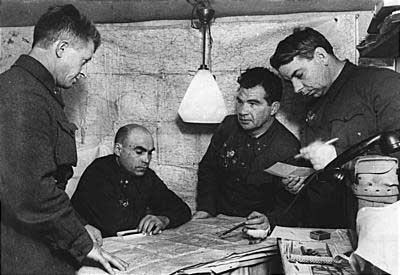Правда о начале войны. ..... Одним из приемов, широко использующихся в манипулятивных техниках, является конструирование и внедрение в массовое сознание ложных метафор. Речь идет о примерах, имеющих лишь внешнее сходство с анализируемым объектом, но при этом совершенно некорректных, в виду того, что ряд существенных деталей в них отсутствует. Яркой иллюстрацией к сказанному служит то, как обыватель анализирует события Великой Отечественной Войны. Наверняка каждому из нас приходилось слышать множество вариаций на тему: «Германия - такая маленькая, СССР - такой большой, а мы так долго отступали! Какой позор!». Если вдуматься, то здесь страна уподоблена человеку, а в человеческом сознании размер напрямую связан с физической силой. Хотя, конечно, мы понимаем, что возможны исключения из правил, что иногда здоровенные детины проигрывают тем, кто пониже и помельче, но это считается именно исключением. А в большинстве случаев более высокий, крупный человек является и более сильным. Но в том то и дело, что страна - не человек. И уподобление одного другому должно производиться очень осторожно и осмысленно. Прямой зависимости между силой армии и площадью территории не существует. Крошечная Англия превратилась в крупнейшую мировую империю. Горстка конкистадоров завоевала целые материки. Малюсенькая Голландия веками удерживала под контролем Индонезию, значительно превосходившую метрополию по территории. На фото: Военный совет 62-ой армии. Слева направо: начальник штаба Н.И.Крылов, командующий армией В.И.Чуйков, член военного совета К.А.Гуров и командующий 13-ой гвардейской дивизией А.И.Родимцев. (Автор фотографии Г. Зельма)