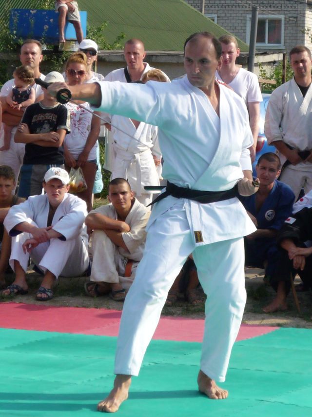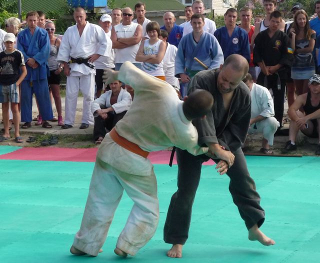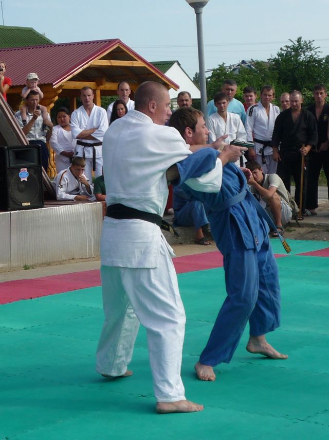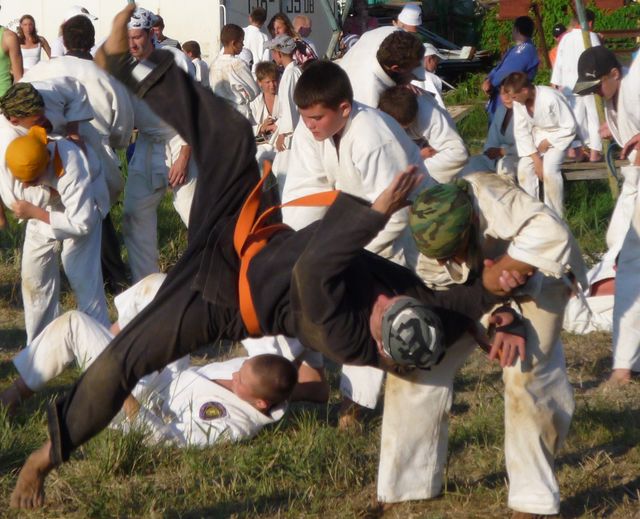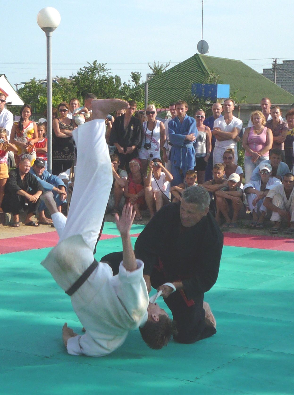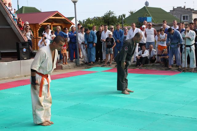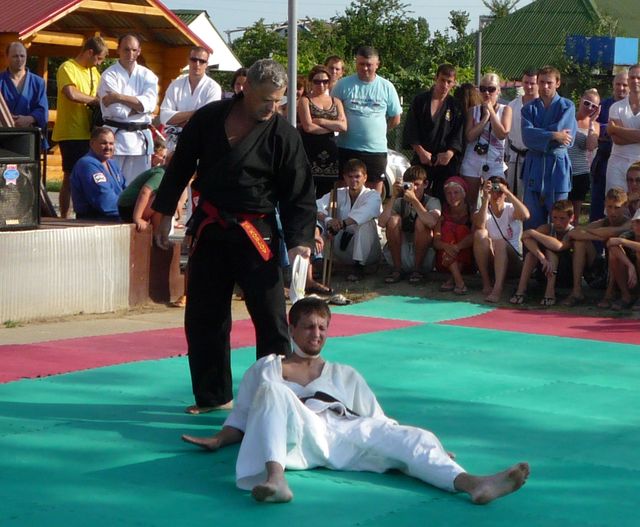 5 июля. День аттестации.. Вдоль лимана выстроились претенденты на следующую степень. Краткий инструктаж..( Спутали технику ката-экзамен окончен. Две ошибки в ката-экзамен закончен. Три ошибки на кю- экзамен закончен. И чем старше пояс тем жестче контрлль. Не сдал ОФП - экзамен закончен, не смотря на сданную технику)Младшие кю контролировал шиха Ляшок и 3 даны. Цветные пояса контролировали шиханы Коблов и Спиваченко, сенсей Ревенко. Черные пояса сам Радишевский Е.А... Понеслась.. каждый кю..каждый дан сдавал все техники с 10 кю.. И чем старше пояс, тем жестче требования..тем быстрее..тем жестче должна выполняться техника... 10,9,8.7.......4,3,2,1 кю.... данхо... шодан.. остались только черные пояса. После техник тамешивари. Кулак, локоть, стопа. Отбивка..30 минут иригуми дзю..Каждая минута меняется партнер. В отбивку вступили шиханы..они ведь будут сдавать на 5 дан. Броски, удары, болевые..Целое поле битвы... Отбивка окончена.. И продолжается экзамен ..Теперь претенденты на 2 дан.. и на старшие степени... Отработана техника..Претенденты на 3 дан... Остаются шиханы.. Коблов..Кретов.. Ляшок.. Техника 4 дан.. Техника 5 дана.. Вокруг стоят все кто сдавали экзамен.. Каждый видит что его ждет..к чему он должен стремится.. Каким он будет.. Завершал экзамен свободный бой..один шихан с танто...другой безоружный.. Свободная атака на поражение, в полную силу.. Успел..молодей..не успел..втои проблемы.. Я не знаю как это объяснить.. удары шли в полную. силу..несмотря на то, что все друг друга знают..что все близкие друзья..никто не давал друг другу ни слабины..ни пощады.. Скорость просто поражала.. удар..киай...бросок..удержание.. отбор оружия..смена ролдей..и непрерывное движение... до команды СТОП.... И аплодисменты всех присутствующих...Непредаваемые впечатления..когда видишь как они улыбаются.. вот только что искаженно лицо..бешеные глаза.. нереальная скорость..и улыбка когда все окончилось... Ляшок садится..Оказывается он работал с сломанным пальцем на ноге.. Ужин. Отбой.