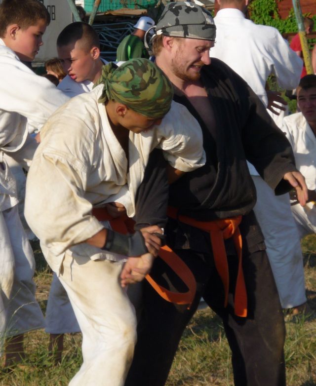 Организация была на уровне.. Комфортабельные номера на базе отдыха "Медик"(кстати сказать рекомендую.хорошая база), трехразовое питание(Качественное!!!!!трех разовое питание).. Что еще нужно для счастья? Правильно! Джиу! А джиу было.. оно было!! Начиная с утра..в 6 подьем и бегом к лиману.. Шихан Кретов проводит комплекс сейхо. С утренней разминки на завтрак..час привести себя в порядок, собраться.. И на море.. Все как в армии..построение..два черных пояса впереди колонны..два сзади..перекрывание движения..выход колонны..и на море... Море!!!!Песок!!!Разойдись народ!!! Бушинкан идет!!! Как ни странно,но все загорающие стабильно не занимали то место где мы тренировались.Площадка протяженностью вдоль моря метров эдак в 100( на глаз..может больше)всегда была свободна. Итак..на море..с 9 до 11..ОФП....набрасывания на песке..в воде...удары ногами на песке...в воде..Думаешь умер..нет..еще не умер..а вот теперь точно умер.. А команда -хаджиме!!!! блин..нельзя умирать!! в бой!!..Все..прошло...можно искупаться..позагорать..малыши так и делали.. Старшие еще в горячке тренировки обсуждают техники..входы.. комментируют проходившее..причем все в движениях..слов почти нет..