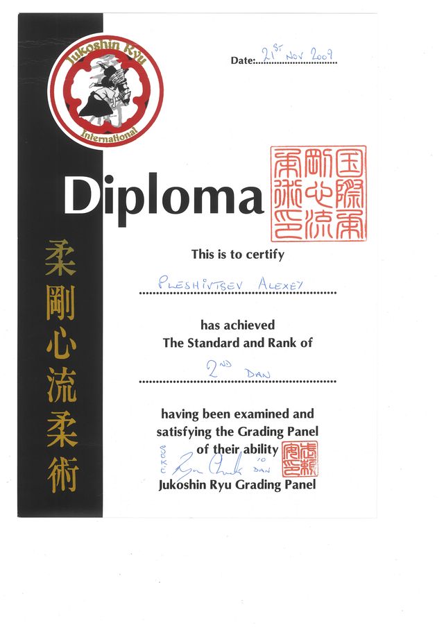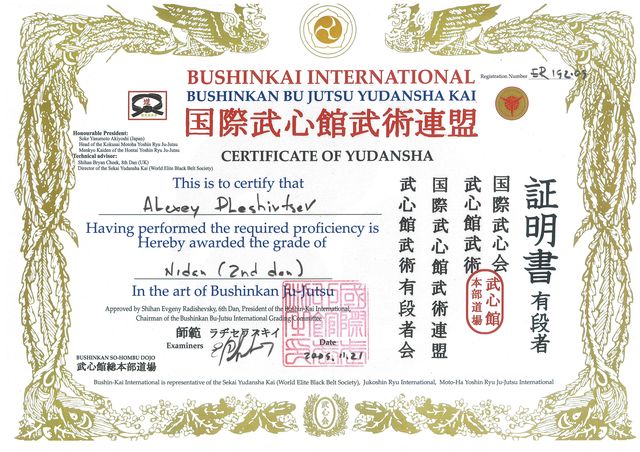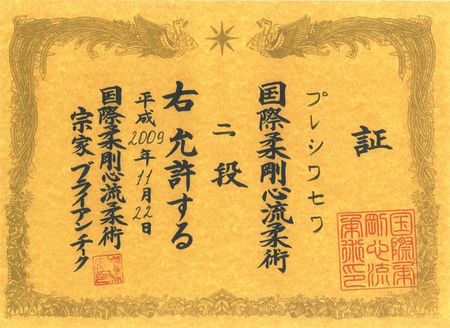 Сертификат нидан Бушинкан дзю-дзютсу. Сертификат нидан Джукошин рю дзю-дзютсу. Соке Браян Чик выдал мне так же сертификат на нидан Джукошин рю выполненный в японской традиции