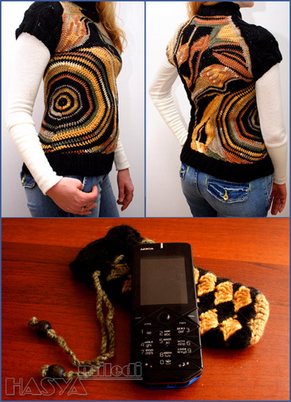 Маруся, работы супер. На безрукавке рисунок понравился. Наверно сочетание спиц и крючка. Я права? А на платье не могу насмотреться. Зацепило очень. Телефону в новом чехольчике наверно очень тепло и уютно . Спасибо за ссылки и за вдохновение новыми работами.
