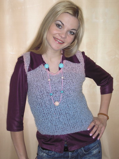 Просто Ксюша, умница, разумница. Вяжи, не ленись. Я с вязанием более уравновешенная стала Жилетка и впрямь приятная, хочется потрогать Расскажи о пряже и как ты её вязала? По кругу? Похожа на букле. Мне очень нравиться пряжа с таким плавным переходом цветов.