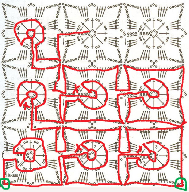 Просто Ксюша, попыталась обвести порядок выполнения работы. Иди по линии, надеюсь, все станет понятно. Последним этапом соединяешь все полумотивы от последнего к первому ряду, формируя "чулок" из мотивов. Крестики - ст. с н. вместо 2 в.п. Иногда приходиться вертеть вязание спереди назад, всё поймешь по ходу. Ещё фишка в том, что б в первом ряду соединить сразу крайние мотивы (зелёные кружки на схеме), ну или сшить их в конце работы, что б ни путаться. Ещё можно их подхватить потом обвязкой. Понятно?