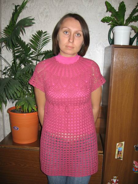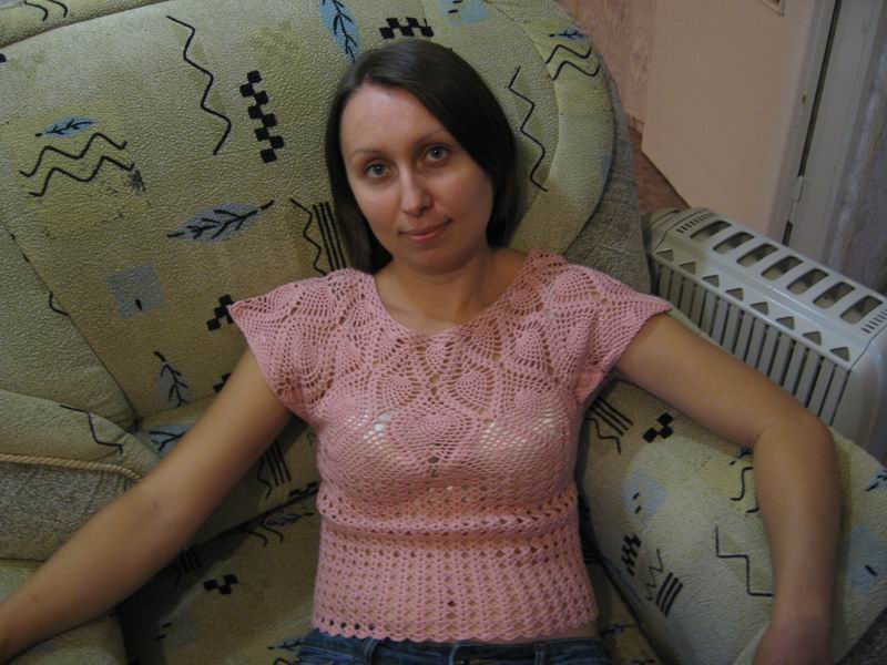 Маруся, спасибо. Совсем засмущали Пряжей в целом довольна: вяжется легко и крючком и спицами, петельки ровные, а вот эффект небольшого пушения полотна после стирки не очень . Хотя, наверное я слишком придираюсь - это все-таки не чистый хлопок. Схем нет. Вязала перед, спинку, рукава до пройм, потом несколько рядов реглана.(прикладывала перед к себе и вязала до тех пор, пока спицевое полотно не закрыло нижнее белье ) Потом перенесла петли спинки, переда и рукавов на одну спицу и крючком закрыла петли (столбиками без накида), ооткорректировав число петель под узор. Дальше вязала кокетку крючком по кругу, уменьшая число столбиков с накидом. Крючковый узор, если нужно, могу выложить после 21-00. Сейчас детки не дадут компьютерные завалы разгребать. Старший уже из-за компа гонит Isadora, спасибо Переделывать не буду,это точно. М.б. племяннице отдам. Ей уже Пе-пешка и сумка - валенок таким же макаром достались. Жду, когда она их сфотает и пришлет, чтоб хоть посмотреть как они на ней.