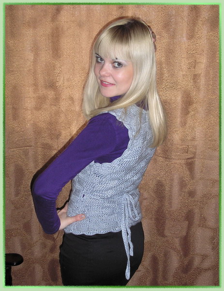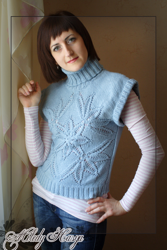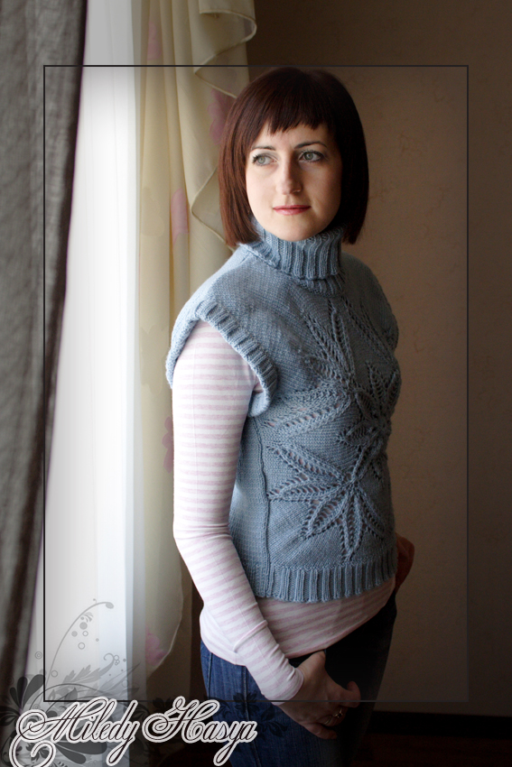 Просто Ксюша, спасибо большое! Он мне самой очень нравиться! Пряжа саммер, крючок №3 Вот тут его вяжут В этой этой теме я выкладывала элементы поближе, там видно фактуру пряжи. Вообще я эту пряжу 3 раза перевязывала целиком готовые изделия, уже совсем потеряла надежду... Сегодня под впечатлением от новой стрижки! Выйти сфоткать на улицу не получилось, пришлось довольствоваться домашними фотками. Жилетка из онлайн темы с Осинки Морозный узор