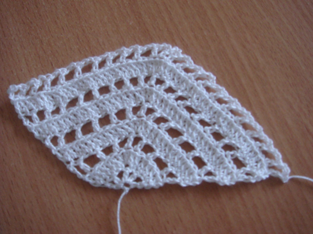 Первая фотка - лицевая сторона. От центра оба края уходят вверх, потом когда начнете вязать от лифа вниз, эти края принудительно в прямую линию выровняются, а треугольник станет выпуклым (т.о. сформируется чашечка). А еще, Марин, попробуй вязать столбики за обе половинки косички столбика с предыдущего ряда. Вторая фотка - изнанка. Внизу "начальный" хвостик заправлен в один из столбиков с накидом. Сверху - две нити завязаны узелком и заправлены в разные стороны вдоль столбиков с накидом. Заправляю ниточки крючком чуть тоньше того, которым вяжу.