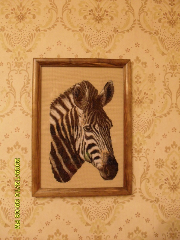 А вот работа одной моей знакомой. Искуссница она в этом деле знатная. Вышивает большие и сложные картины, побеждает с ними на выставках. Картинка немного отсвечивает из-за стекла.