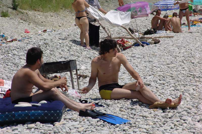 мы в самом начале остановились у частника по 250р/чел. Но,сами знаете,переночевал,поел и на пляж. Вечером - искупался,поел и спать. Так прошло три дня. Потом познакомились с москвичами на пляже. Они жили в палатке. Нас соблазнили. Мы брали с собой палатку в поездку. Переселились к ним по-соседству. Должен вам доложиь-это что-то!!! Засыпаешь под шум прибоя,так же просыпаешся. Еда на костре. Дров немеренно-море снабжает. Искупаться можно в душевых пансионата бесплатно. Народ на пляже дружественный. Вот честно говорю-откровенно отдохнули и душой и телом от цивилизации. Да и на пляж и с него не надо ходить. Нам понравилось. Вот некоторые фото-пляж пансионата с мелким галечником,дикий пляж-там галечник весьма крупный! Пляжные тапочки будут в самую тему!