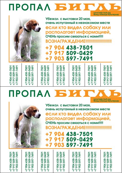 В воскресенье на выставке в районе стадиона Зенит потерялась собака породы БИГЛЬ, кобель. Приблизительно 40 см в холке, трёхцветный, уши висячие, кончик хвоста белый. СОБАКУ ОЧЕНЬ ИЩУТ И ОЧЕНЬ ЖДУТ, пожалуйста кто видел кто знает сообщите по телефонам. Если есть возможность сообщите ближайшим собачникам. Мой контактный номер +7 904 438 75 01