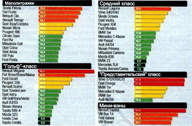 foRED В прошлых годах, если я не ошибаюсь, то Рено Клио стояла так же на "высшем месте". Сейчас немного улучшилась... Dimitry Да разбиты они ведь примерно, наверное просто из за итого, что бы читатель быстрее нашёл нужную машину. Ведь машины занесены лишь по одному, одинаковому критерию - количество поломок в год на 1000 эксплуатируемых машин. По идее, их можно было все в одну группу занести, правда не удобно читать это было бы. Один вопрос - и на чём же основан хороший имидж Вольво? Во всяком случае не на их качестве