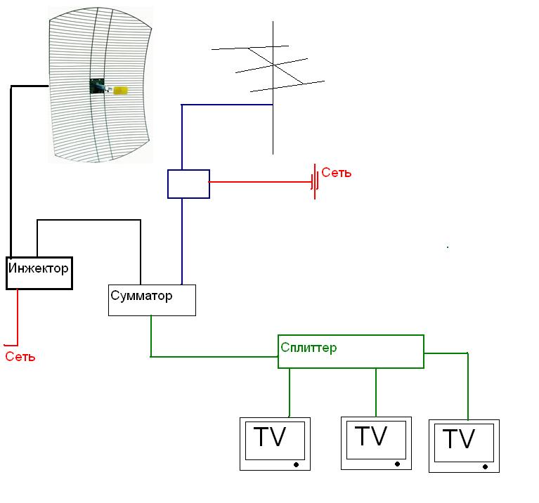 Небольшое уточнение: сумматор-фильтр для MMDS имеет сквозной канал на антенну MMDS, что позволяет подключать питание этой антенны (инжектор) как до, так и после сумматора (вариант - антенны на крыше).