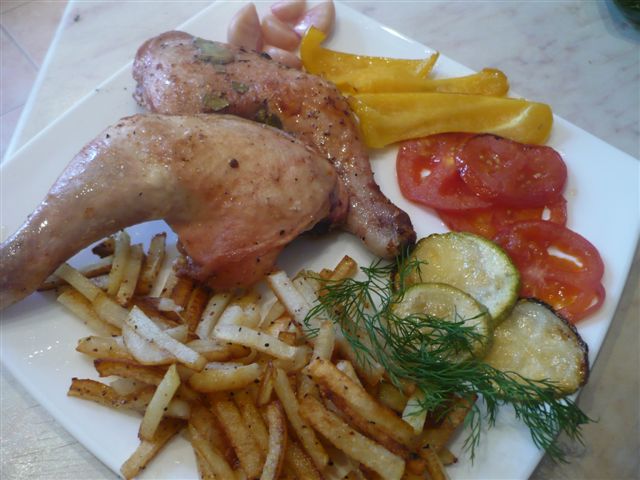 Тэкс... мариновала сегодня курочку. На 3-4 окорочка: 1 лимон, 1 луковица, 2 помидора, соль, перец, аджика сухая, лавровый лист. Из лимона выжимаем весь сок, помидоры режем как на салат, лук кольцами, лаврушку разминаем. Курицу во всем этом вымешиваем, накрываем тарелкой и ставим груз. Так она у меня стояла 4 часа, просто на полу в кухне. Затем выкладываем куру на противень, туда же кольцами нарезанные кабачок, помидор, баклажан, перец и в духовку на 30 минут. Картошечку пожарила отдельно... Смели в один присест!