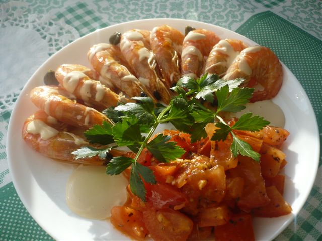 Для любителей креветок, один из моих любимых рецептов: Что нам понадобится: Креветки тигровые (или королевские, в принципе и мелкие можно) - 8 штук Майонез - 2 ст. ложки соевый соус - 2 ст. ложки Помидор - 1 крупный или пару мелких орегано или смесь итальянских трав,соль, перец - по вкусу чеснок - ползубчика Базилик (у меня не было в последний раз. каперсы, если любите. Креветки прямо замороженные выкладываем на сковору с толстым дном с уже раскаленным маслом и тушим их, пока вся жидкость не испарится, они прям поджаренные получаются, мням.... Смешиваем соевый соус с майонезом. Отдельно режем помидоры кубиками, тушим с орегано, базиликом и чесночком, пока они не станут мягкими, но чтобы форму не потеряли. Выкладываем на тарелочку все по отдельности! ВКУСНО!!!!!!!!