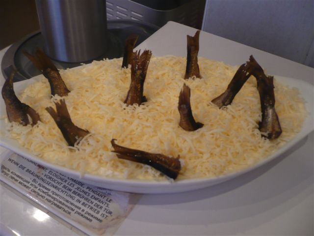 Dreams, я рада, что мы друг друга поняли А я с салатиком "Рыбки в пруду". Вчера как раз готовила. Просто и вкусно Итак, нам понадобится: вареный картофель - 1 крупная картофилина вареные яйца - 2 шт банка шпрот сыра немного майонез чеснок 1 слой: картофель тертый на крупной терке майонез 2: шпроты, вилочкой помятые (хвостики отломить и отложить) майонез 3: яйца, натертые на крупной терке майонез с чесноком 4: сыр на мелкой терке и воткнуть сверху хвостики от шпрот. Мы ели через 2 часа после приготовления, было вкусно. Но сегодня(постояв ночь в холодильнике) он стал намного сочнее и вкуснее!