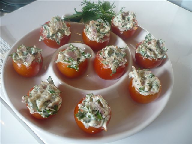 Помидорчики-черри(они лучше идут,я уже эксперементировала.Нужно чтобы раз,и в ротик) освободить от серединки, Бекон или грудинку(как была у меня) порезать и поджарить до золотистого цвета. Майонез,зелень,бекончик смешать и начинить помидорки.Вы не представляете,как это вкусно.