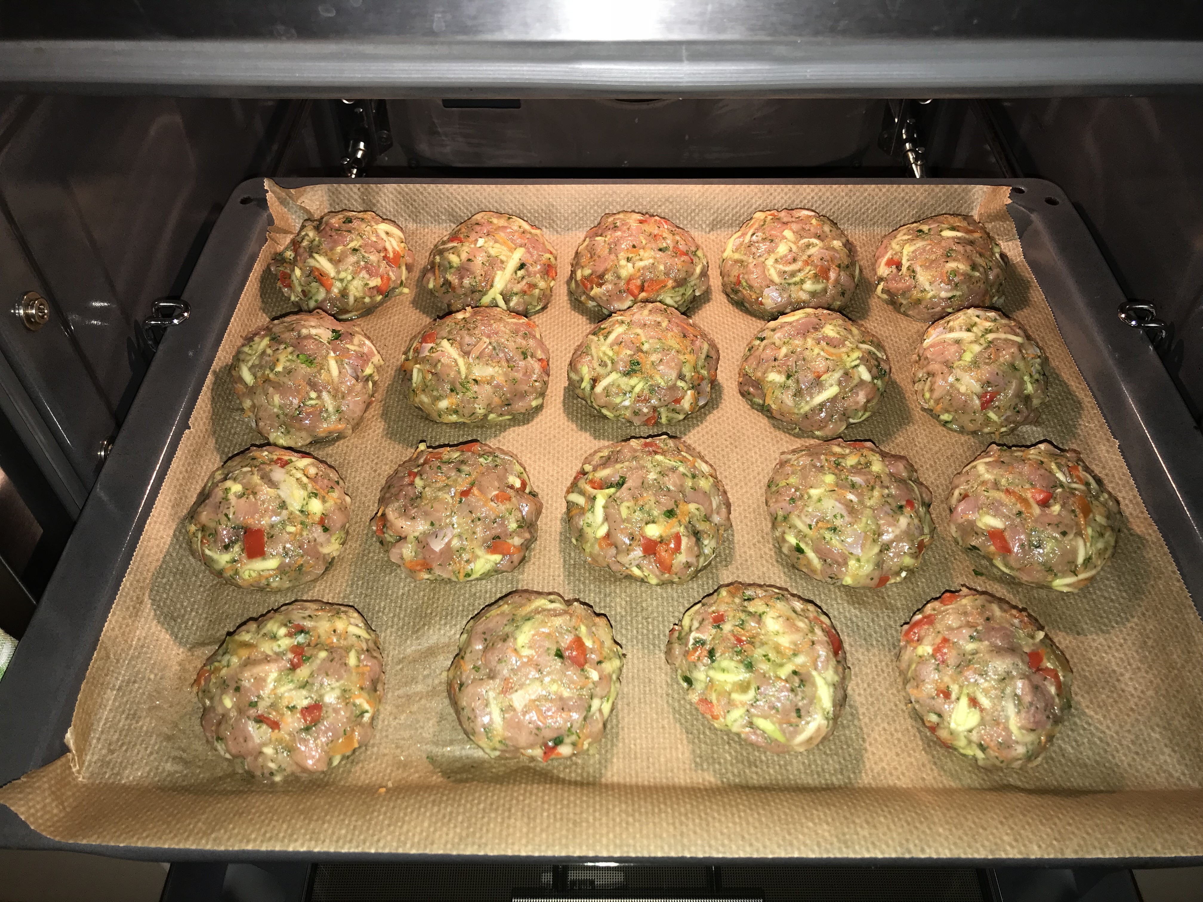 Котлеты куриные с овощами в духовке Состав: 0,5кг фарша куриного 1 кабачок на крупной тёрке 1 морковка на мелкой тёрке 1 головка репчатого лука, укроп, петрушка, чеснок - измельчить в измельчителе соль, чёрный молотый перец, паприка Всё смешать и в духовку минут на 30 при 180С.