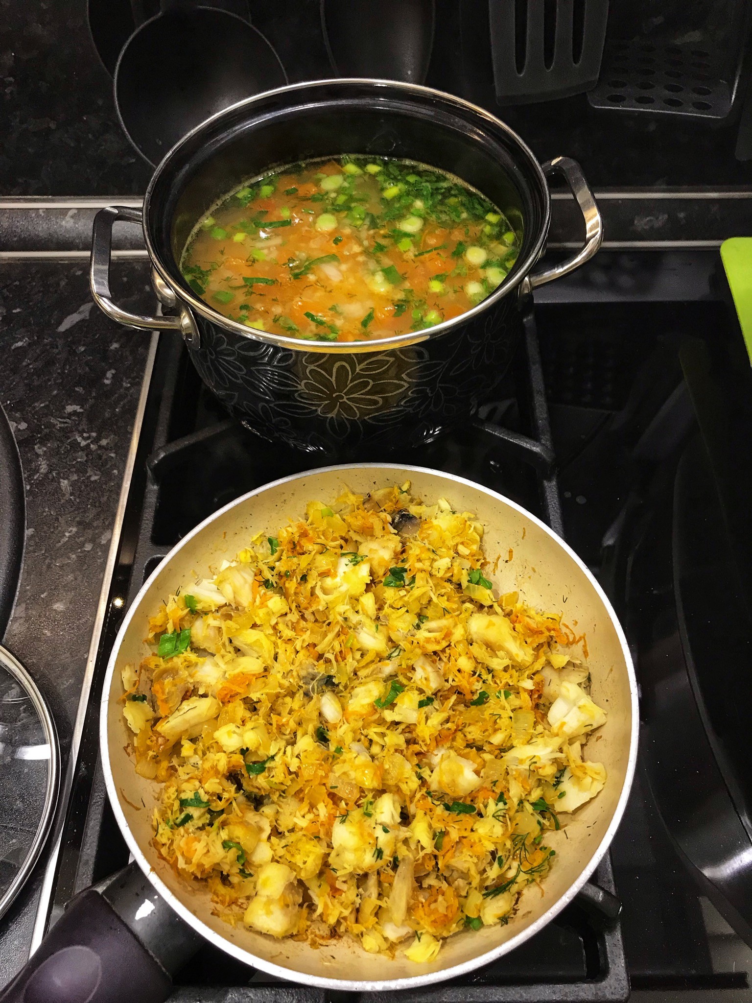 Треску отварить в воде с добавлением соли, молотого чёрного перца, прованских трав и оливкового масла. Рыбу достать и убрать кости. Лук мелко нарезать, морковь на мелкой терке, обжарить на сливочном масле. К овощам добавить рыбу, зеленб (укроп, петрушка, зелёный лук) перемешать, прогреть. Готово) Из бульона получилась уха.