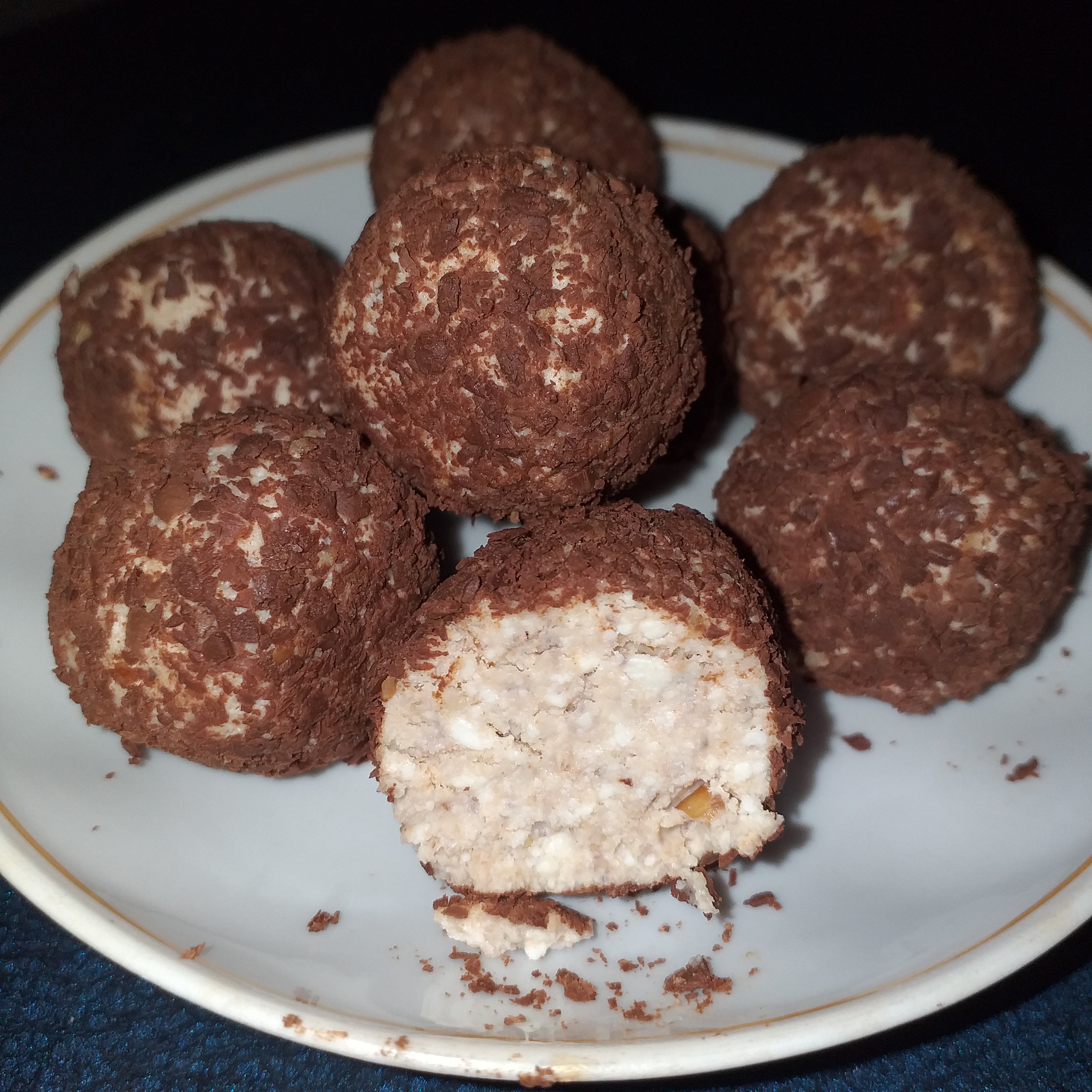 Всем добрый вечер. Хочу поделиться рецептом простой вкусняшки из творога. Количество ингредиентов для ориентира, все можно смешивать на ваш вкус) Полезные конфетки из творога Ингредиенты: Творог— 1 пачка (180-200гр) Орехи — 1 ст.л. Печенье (любое) — 70-90 гр Сахар по вкусу. Шоколад, или какао, или кокосовая стружка, мак, орехи - для обваливания. Из этого количества продуктов получается примерно 16-18 конфеток размером с небольшой грецкий орех. Приготовление: 1. Творог довести до более-менее однородного состояния - протереть через сито, разбить блендером или просто хорошо размять вилкой. Печенье измельчить. Смешать с сахаром, добавить в массу измельченное печенье и орехи, перемешать до однородного состояния. 2. Из получившейся массы сформовать конфетки. Обвалять в тертом шоколаде (или в чем душа пожелает). Получившиеся конфетки охладить в холодильнике около 1 часа. Приятного аппетита! -- п.с. Забыла - по такому же принципу можно сделать закусочный вариант) Творог + измельченные сухарики + орехи + мелко порезанная зелень + чеснок и соль по вкусу. Для обваливания тоже что угодно - натертый сыр, крабовые палочки, мелко порезанный и чуть подсушенный укроп и тд.