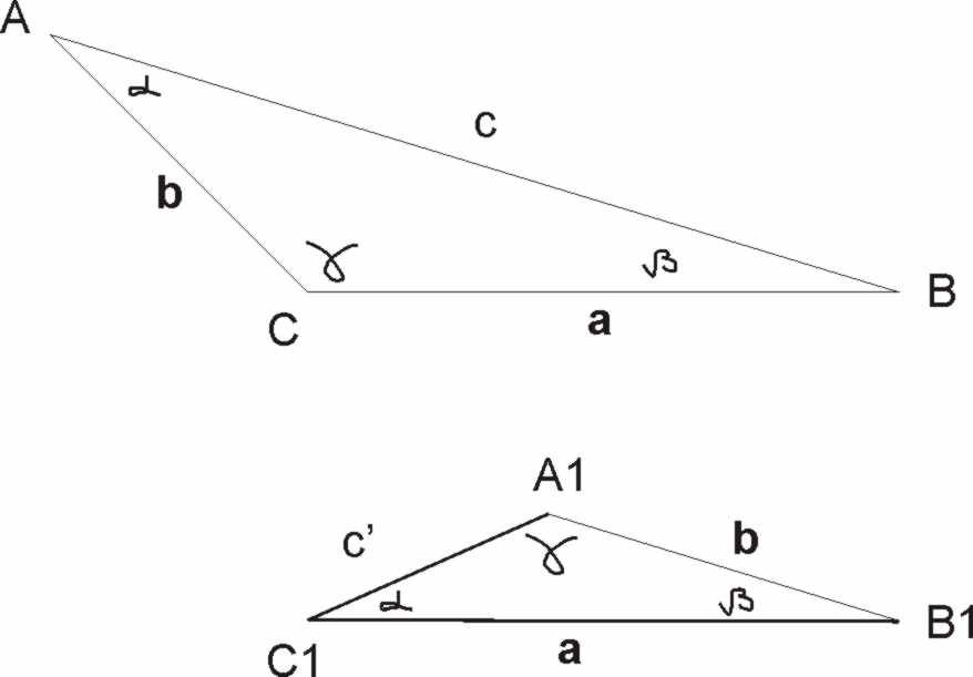 ок, значит описываем задачу строго имеются 2 треугольника ABC и A1B1C1 Обозначим длину AB как c, BC - a, AC - b Обозначим угол BAC как альфа, ABC бета, BCA гамма В треугольнике A1B1C1 есть 2 стороны, которые имеют длину a и b, 3 угла, имеющие величины альфа, бета, гамма Вопрос: равны ли треугольники ABC и A1B1C1 P.S. Надеюсь при такой постановке не будет кривотолков P.P.S Приношу извинения, если первоначальная постановка задачи для кого то была двоякой добавлено через 25 минут Интереснее выслушивать умные и безапелляционные утверждения взрослых об "очевидных" фактах добавлено через 34 минуты Я убрал двоякость. Убрав возможность предположений типа вашего ответа с картинкой.