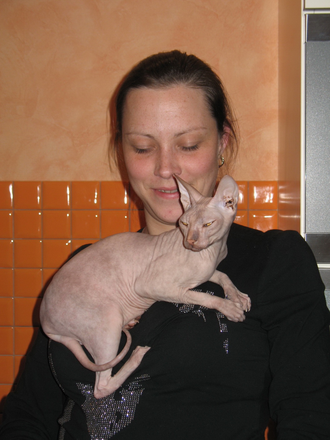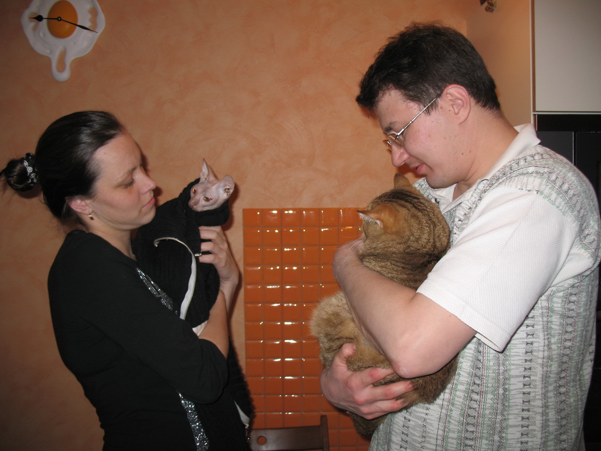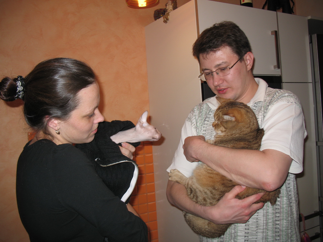 Да я сама проиллюстрирую! Вместе с сопроводительным письмом! Привет Катечка! Мы решили познакомить соседскую лысую кошку с нашим Даней. Даня, наверно решил, что это крыса. Зафырчал и стал нападать- дал со всей дури по кошке лапищей своей. Хорошо, что промазал. Чтобы разбавить твои трудовые будни, высылаю момент знакомства и вид необычной кошки, очень похожей на свою хозяйку. :-))