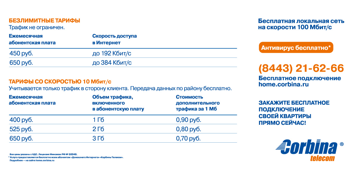 У Колумбии уже 512 за 512 без ограничений по объему.. У Домика Мегабит, так что пока Корбина курит.. Мне больше понравилось где скорость не режут.. чето там за 650 руб. Тока там 3 гига включено вроде....Думаю пересмотрят они тарифную политику когда начнут активно подключать абонентов. И видится мне, что скорее всего будет такой ход.. Подключайтесь мол, инет бесплатно, до конца года.. или чет подобное. Красотища..Им пятками назад нельзя, уже много вложено. А нам тока на руку. добавлено через 38 секунд Коммунизьм короче