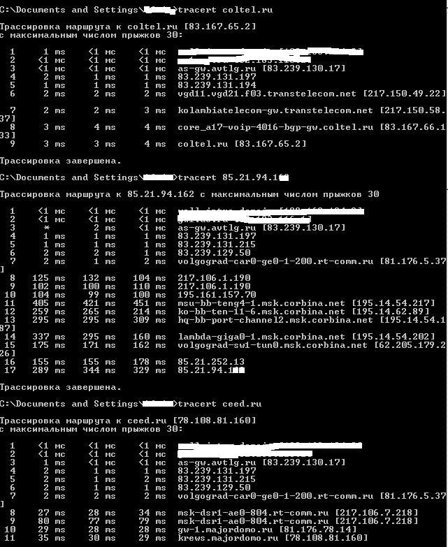 Kairel, Я что ли? Так я лишь в роли передатчика выступал. Сейчас уже молчу, ибо нафиг harsh, Ну мы уже года полтора на корбине сидим. Дорого, конечно (в три раза дороже чем магистральные операторы нам сейчас предлагают), да и задержки великоваты. Техсаппорт в основном московский, отрабатывают чётко, дольше времени уходит на объяснения что мы с Волгограду. Hunter_Sova, Куда надо? Вот пара наугад: Трассировка маршрута к ya.ru [213.180.204.8] с максимальным числом прыжков 30: 1 <1 мс 2 ms <1 мс 192.168.10.1 2 1 ms 1 ms 1 ms 85.21.94.хх 3 1 ms 2 ms 1 ms 85.21.252.14 4 144 ms 254 ms 230 ms lambda-tun2.msk.corbina.net [62.205.179.225] 5 183 ms 228 ms 202 ms hq-bb-giga1-10.msk.corbina.net [195.14.54.201] 6 246 ms 264 ms 287 ms ko-bb-teng-13-8.msk.corbina.net [195.14.54.92] 7 167 ms 184 ms 175 ms msu-bb-ten-3-5.msk.corbina.net [195.14.54.107] 8 148 ms 207 ms 171 ms yandex.msk.corbina.net [195.14.32.50] 9 222 ms 135 ms 103 ms ya.ru [213.180.204.8] Трассировка маршрута к ixbt.ru [81.19.69.12] с максимальным числом прыжков 30: 1 <1 мс 2 ms <1 мс 192.168.10.1 2 1 ms 1 ms 1 ms 85.21.94.1хх 3 1 ms 2 ms 1 ms 85.21.252.14 4 216 ms 279 ms 239 ms lambda-tun2.msk.corbina.net [62.205.179.225] 5 165 ms 206 ms 189 ms hq-bb-giga1-10.msk.corbina.net [195.14.54.201] 6 215 ms 235 ms 145 ms ko-bb-teng-13-8.msk.corbina.net [195.14.54.92] 7 116 ms 145 ms 150 ms m10-bb-teng4-3.msk.corbina.net [195.14.54.206] 8 172 ms 161 ms 132 ms may-cr01-te2-2.msk.stream-internet.net [195.34.36.157] 9 269 ms 277 ms 296 ms ss-cr01-te3-2.msk.stream-internet.net [195.34.59.205] 10 252 ms 284 ms 214 ms m9-cr01-po3.msk.stream-internet.net [195.34.53.85] 11 174 ms 188 ms 235 ms m9-cr02-po1.msk.stream-internet.net [195.34.59.54] 12 122 ms 132 ms 166 ms Rambler-m9.msk.stream-internet.net [195.34.53.146] 13 178 ms 293 ms 178 ms vs6509-j-m9.ramtel.ru [81.19.64.93] 14 167 ms 187 ms 167 ms ge-0-2-cs7206.ramtel.ru [81.19.64.70] 15 149 ms 193 ms 190 ms www.ferra.ru [81.19.69.12] Трассировка завершена. Трассировка маршрута к forum.volgograd.ru [83.239.131.35] с максимальным числом прыжков 30: 1 <1 мс 2 ms <1 мс 192.168.10.1 2 1 ms 1 ms 1 ms 85.21.94.1xx 3 1 ms 2 ms 2 ms 85.21.252.14 4 144 ms 160 ms 149 ms lambda-tun2.msk.corbina.net [62.205.179.225] 5 167 ms 151 ms 127 ms hq-bb-giga1-10.msk.corbina.net [195.14.54.201] 6 152 ms 183 ms 205 ms ko-bb-port-channel2.msk.corbina.net [195.14.54.186] 7 161 ms 151 ms 160 ms k9-bb-teng3-1.msk.corbina.net [195.14.54.125] 8 223 ms 148 ms 99 ms m9-bb-teng4-3.msk.corbina.net [195.14.60.130] 9 130 ms 148 ms 171 ms msk-bgw1-ae0-344.rt-comm.ru [195.161.157.69] 10 272 ms 191 ms 215 ms 217.106.6.14 11 223 ms 273 ms 189 ms 81.176.5.38 12 225 ms 216 ms 207 ms 83.239.129.49 13 180 ms 84 ms 107 ms colocation-01.avtlg.ru [83.239.131.35] Обмен пакетами с forum.volgograd.ru [83.239.131.35] по 32 байт: Ответ от 83.239.131.35: число байт=32 время=731мс TTL=49 Ответ от 83.239.131.35: число байт=32 время=717мс TTL=49 Ответ от 83.239.131.35: число байт=32 время=569мс TTL=49 Ответ от 83.239.131.35: число байт=32 время=756мс TTL=49 Статистика Ping для 83.239.131.35: Пакетов: отправлено = 4, получено = 4, потеряно = 0 (0% потерь), Приблизительное время приема-передачи в мс: Минимальное = 569мсек, Максимальное = 756 мсек, Среднее = 693 мсек