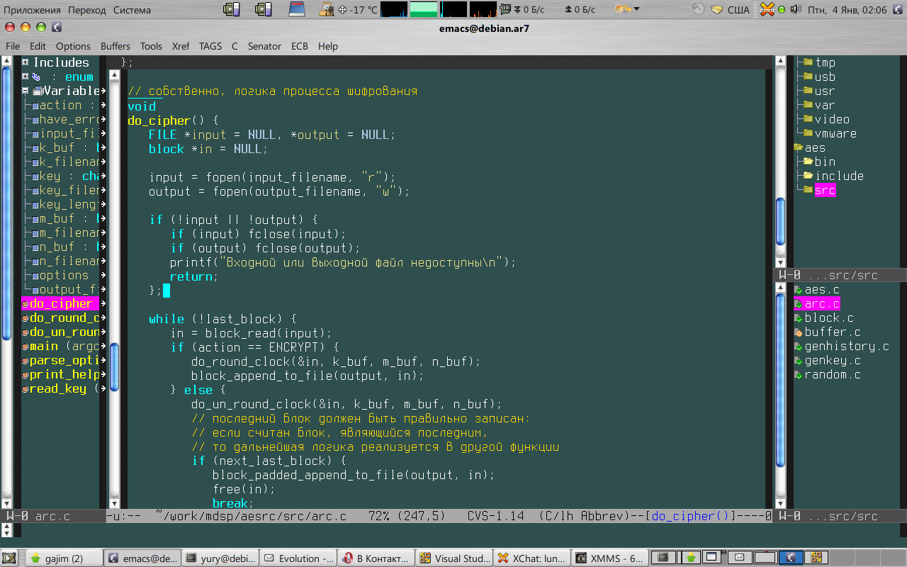 Первый - просто десктоп, общий вид так скащать, торои - консоль, с запушенным обновлением доступного софта - "портов" как их зовут. Третий - аналог эксплорера, четвертый - неплохои менеджер служб сообщений, держит аску, жаббер, ирк, маилру, и тд и тп, четвертый - скриншот одного товарища-разработчика из Таганрога - редактор emacs в графическои оболочке Gnome (у меня KDE). У него правда то ли Debian толи Gentoo , линукс короче.